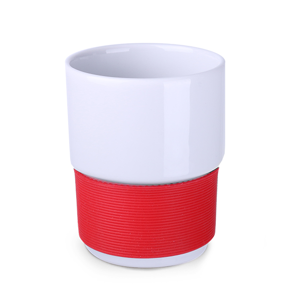 Mittelgroßer Werbebecher aus Porzellan ohne Henkel. 40 mm breite Bänder, erhältlich in 7 Farben: weiß, orange, rot, grün, marineblau, braun und schwarz.