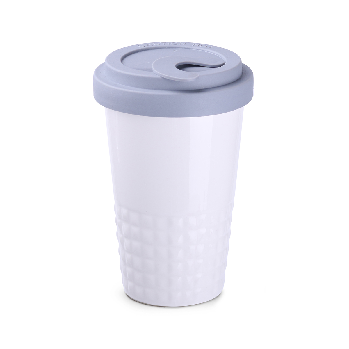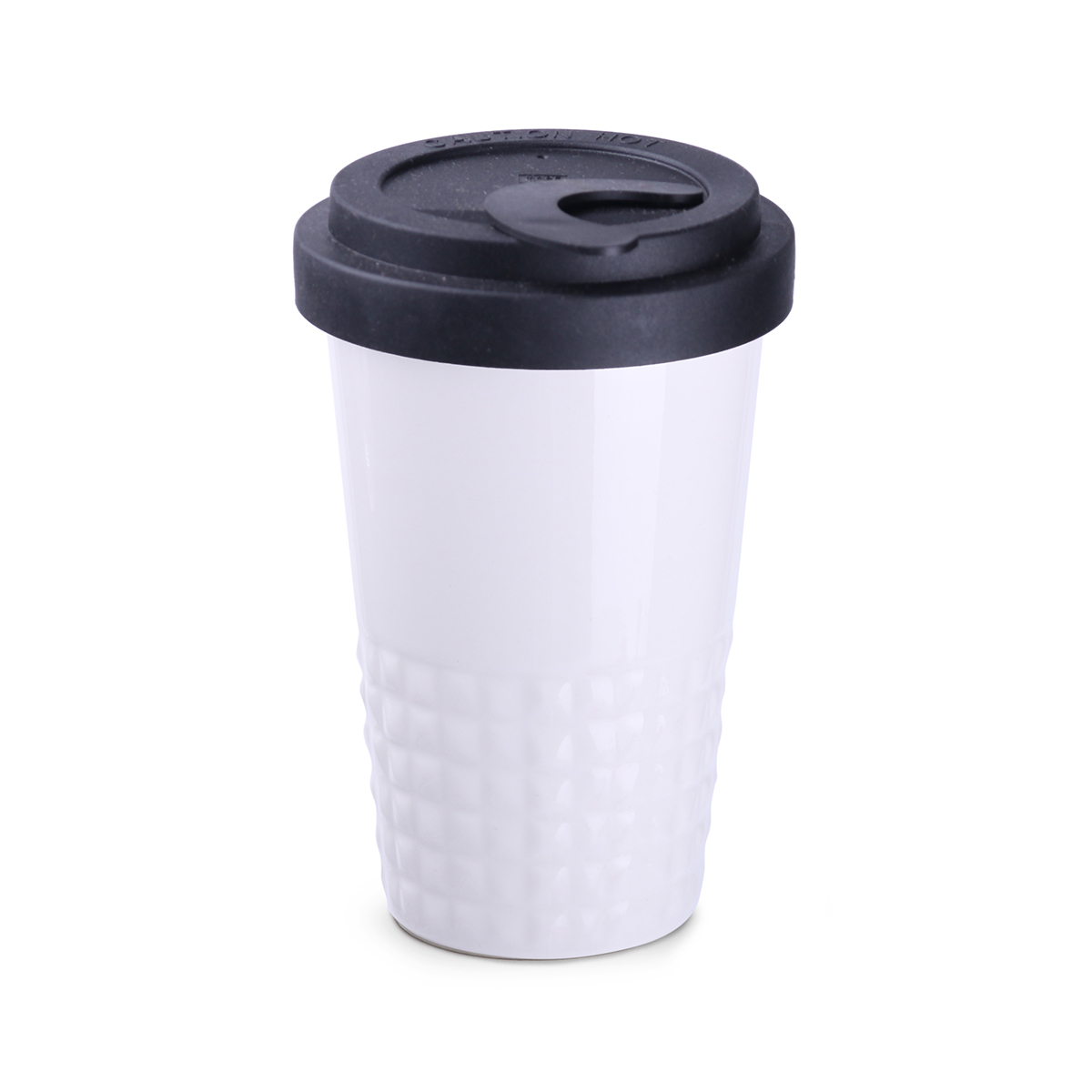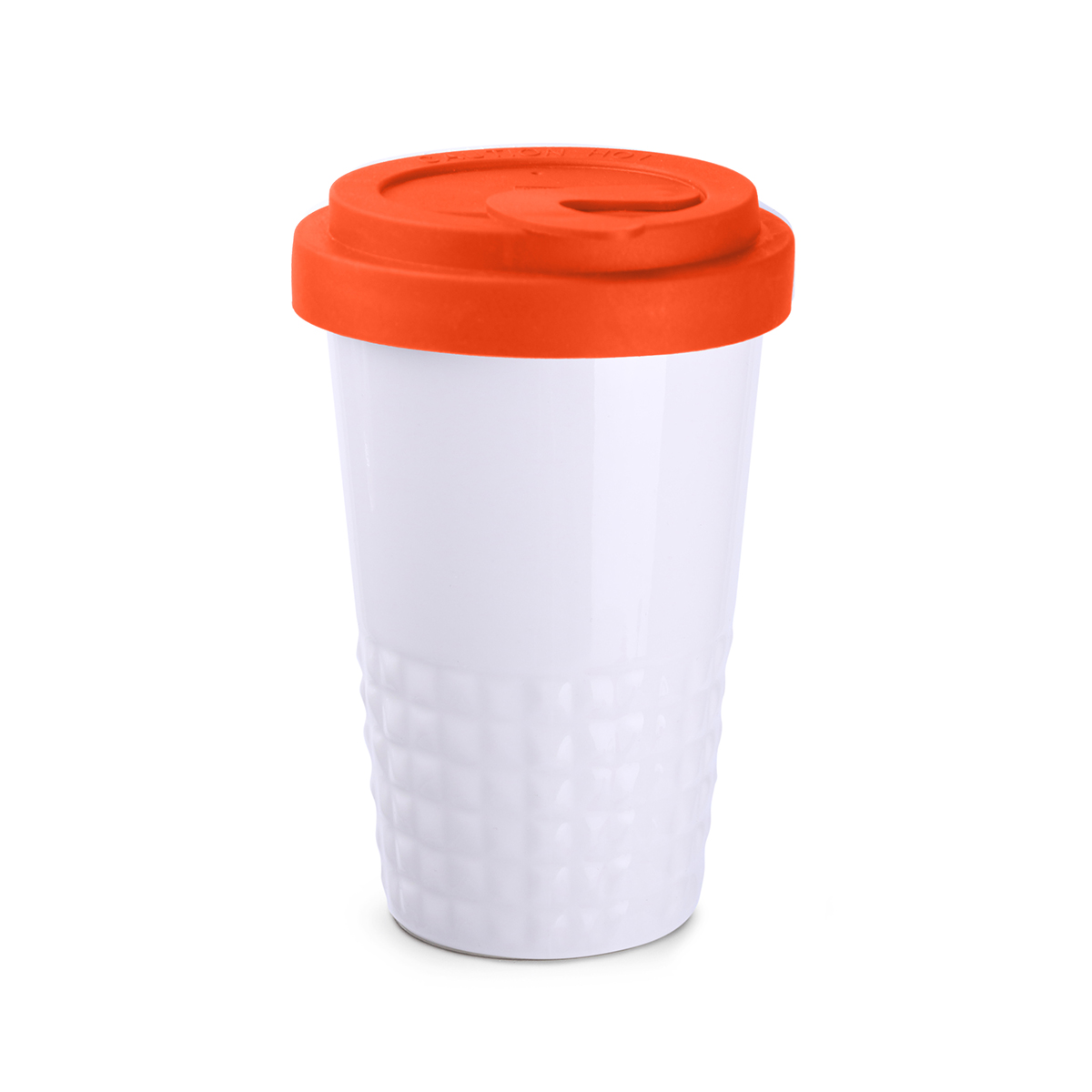 Neuheit auf dem Markt für Werbekeramik. Dezente Ausführung des unteren Tassenbereichs in Form symmetrischer Erhebungen. Doppelwandige Porzellantasse mit hervorragender Wärmeisolierung. Besonders dicht schließender Deckel. Modell für aktive Nutzer. Der Deckel ist in folgenden Farben erhältlich: Weiß, Orange 021C, Cool Gray 7, Marineblau 294C, Braun 4695C, Schwarz, Rosa 4064C, Blau 2144C, Eukalyptus 5493C, Desert Sand 2310C.