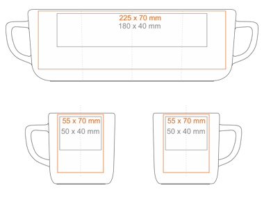 Auf dem Tassengriff (40x10 mm) Auf der Innenwand (60x15 mm) Auf dem Boden innen (ø30 mm) Aufdruck von unten (ø40 mm) Druck über den Rand Personalisierung Personalisierung Graveur |