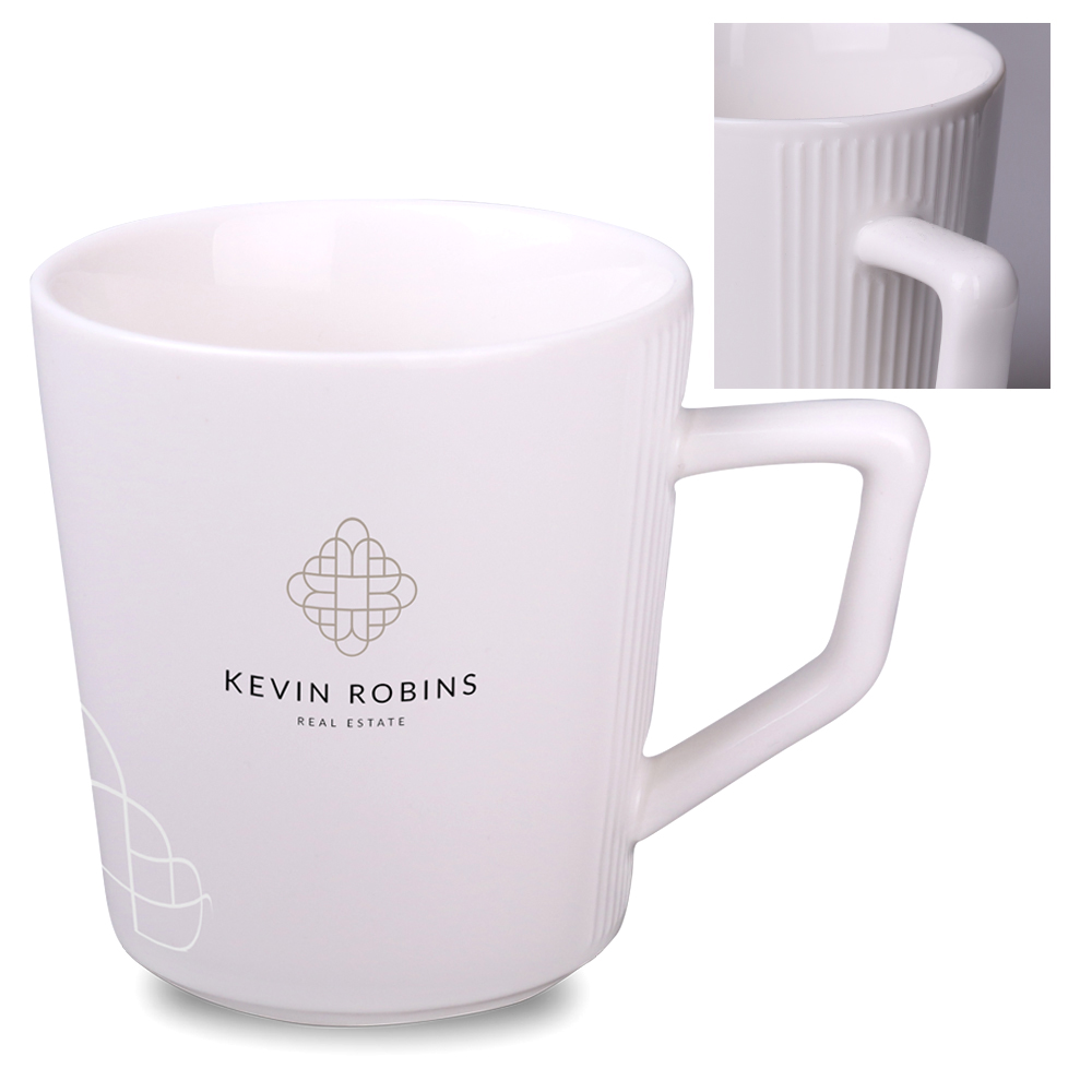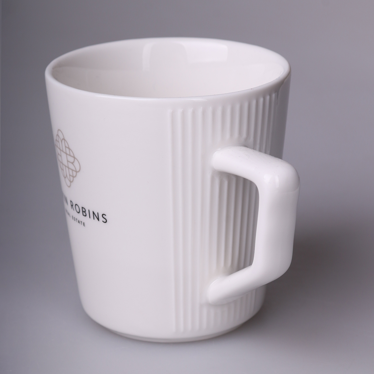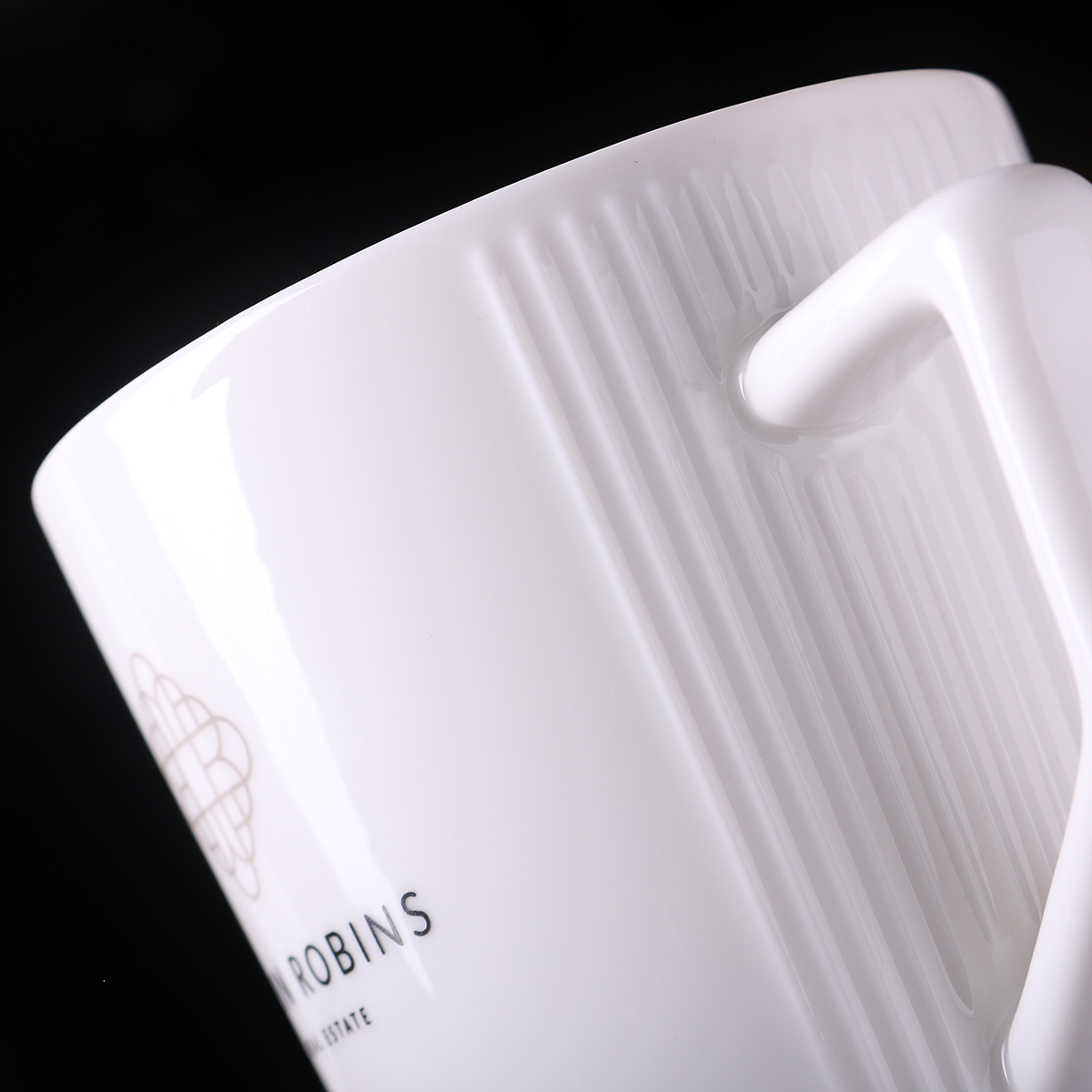 Origineller Becher aus hochwertigem Porzellan. Mit stilvollen Prägungen auf beiden Seiten des Henkels. Er zeichnet sich durch einen interessant gestalteten Henkel aus.
