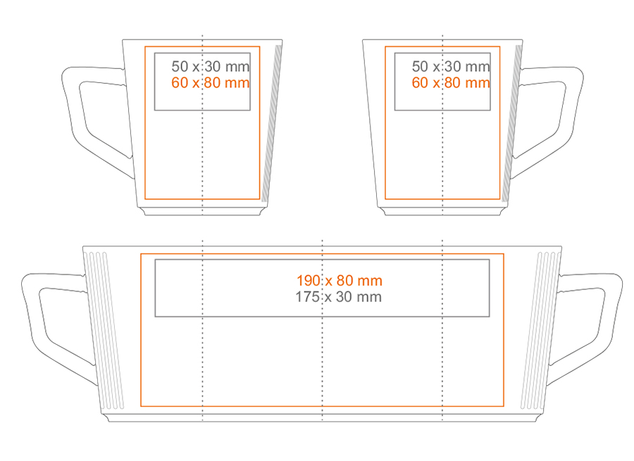 Auf dem Tassengriff (50x9 mm) Auf der Innenwand (40x20 mm) Auf dem Boden innen (ø35 mm) Aufdruck von unten (ø42 mm) Goldaufdruck Silberaufdruck Handarbeit - Einfärbung des Randes Personalisierung |